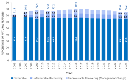 Despite strong legal designation, pressures on the condition of these protected sites persist and can compromise their biodiversity value. National statistics on protected nature features published by NatureScot indicate that, as of March 2025, 75.2 % of assessed natural features on protected sites in Scotland are in favourable or recovering condition, with the remainder in unfavourable condition or declining (Figure 1). While this figure shows a long-term improvement, it also underscores that roughly 24.8 % of features remain in less than ideal condition, suggesting ongoing pressures. These conditions can reflect challenges such as disturbance to sensitive bird nesting sites, changes in hydrology or sediment dynamics, and the spread of invasive species, all of which require active management to address.