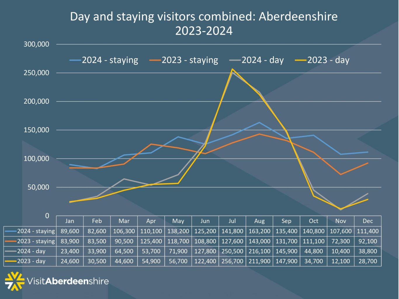 Figure 1: Day and staying visitors combined in Aberdeenshire 2023-2024, VisitAberdeenshire